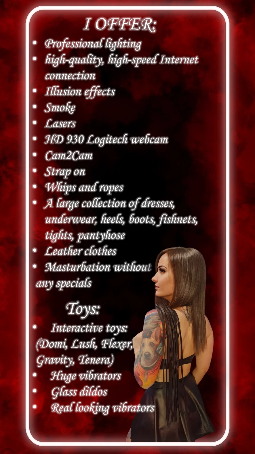 Ahegao, Smoking, Facial, Topless, Heels, Nylon, Deepthroat, Blowjob, Latex, Foot Fetish, Mistress, Tittyfuck, Doggy Style, Twerk, Flashing, Camel Toe, Footjob, Handjob, Erotic Dance, Striptease, Cock Rating, Leather, Dildo or Vibrator, Strapon, Pegging, Corset, Cosplay, Jerk-off Instruction, Hardcore, Humiliation, Masturbation, Oil Show, Role Play, Squirt, Sex Toys, Cumshot